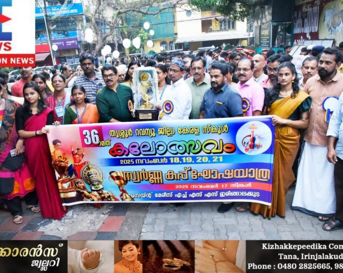 36-മത് തൃശ്ശൂർ റവന്യു ജില്ല കേരള സ്കൂൾ കലോത്സവം; വർണ്ണാഭമായി ഘോഷയാത്ര ഇരിങ്ങാലക്കുട : കലാമാമാങ്കത്തിന് മുന്നോടിയായി വർണ്ണാഭമായി ഘോഷയാത്ര. ഇരിങ്ങാലക്കുടയിൽ നവംബർ 18 മുതൽ 21 വരെയുള്ള ദിവസങ്ങളിൽ 22 വേദികളിലായി അരങ്ങേറുന്ന 36- മത് തൃശ്ശൂർ റവന്യു ജില്ലാ സ്കൂൾ കലോത്സവത്തിന് മുന്നോടിയായി സ്വർണ്ണക്കപ്പുമായി നടന്ന ഘോഷയാത്ര സെൻ്റ് മേരീസ് സ്കൂൾ പരിസരത്ത് നിന്ന് ആരംഭിച്ച് പട്ടണം ചുറ്റി മുഖ്യവേദിയായ ടൗൺ ഹാളിൽ സമാപിച്ചു. ഡിഡിഇContinue Reading