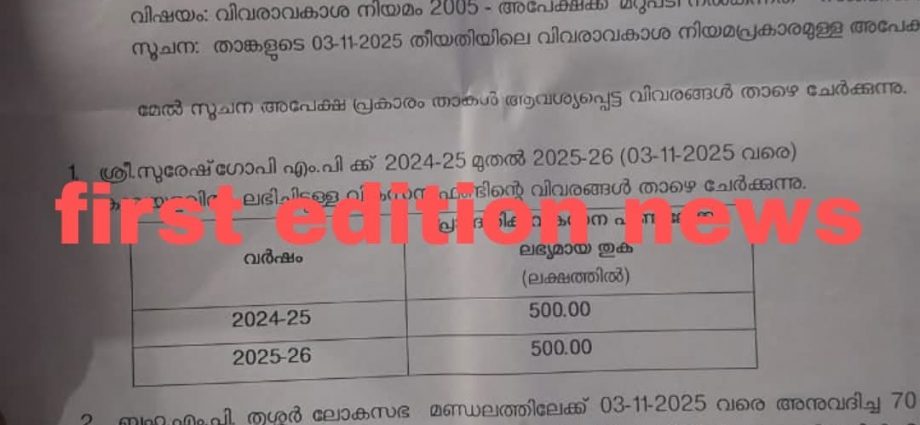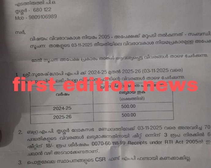 ഒന്നര വർഷം കൊണ്ട് തൃശ്ശൂർ എംപിയുടെ പ്രാദേശിക വികസന ഫണ്ടിൽ നിന്നും നിർമ്മാണം പൂർത്തീകരിച്ചത് ഒരു പ്രവൃത്തി മാത്രമെന്ന് വിവരാവകാശ രേഖ
