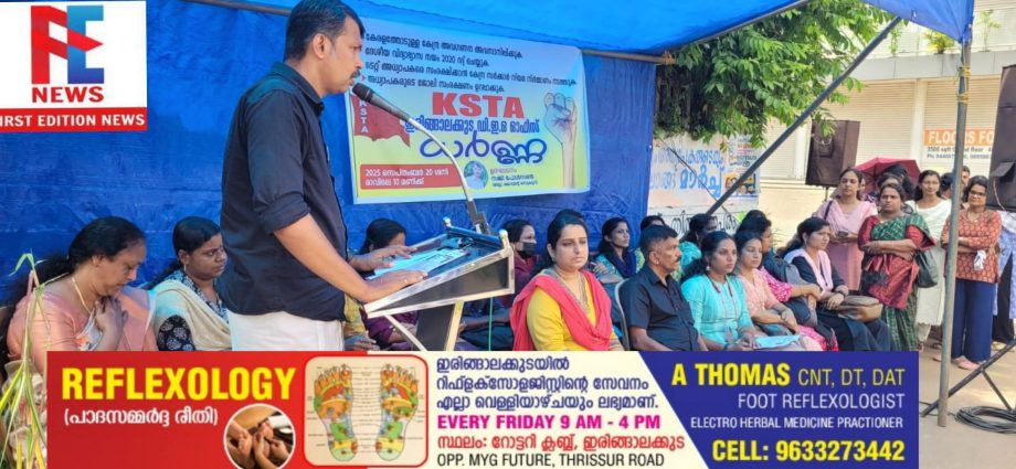 ഇരിങ്ങാലക്കുട : കേന്ദ്ര അവഗണന അവസാനിപ്പിക്കുക,ടെറ്റ് അധ്യാപകരെ സംരക്ഷിക്കാൻ കേന്ദ്ര സർക്കാർ നിയമനിർമ്മാണം നടത്തുക,നിലവിലുള്ള അധ്യാപകരെ ഒഴിവാക്കുക, അധ്യാപകരുടെ ജോലി സംരക്ഷണം ഉറപ്പാക്കുക തുടങ്ങിയ ആവശ്യങ്ങൾ ഉന്നയിച്ച് കെഎസ്ടിഎ ഇരിങ്ങാലക്കുട ഉപജില്ല കമ്മിറ്റിയുടെ ധർണ്ണ . ഡിഇഒ ഓഫീസിന്റെ മുൻപിൽ നടന്ന ധർണ്ണ ജില്ല ജോയിൻ്റ് സെക്രട്ടറി സജി സി പോൾസൺ ഉദ്ഘാടനം ചെയ്തു. ഉപജില്ലാ പ്രസിഡണ്ട് വർഷ രാജേഷ് അധ്യക്ഷത വഹിച്ചു. ഉപജില്ലാ സെക്രട്ടറി കെ ആർ സത്യപാലൻ , ജില്ല എക്സിക്യൂട്ടീവ് അംഗം വിദ്യ കെ വി , ഉപജില്ല വൈസ് പ്രസിഡന്റ് ഷീല പി എ തുടങ്ങിയവർ സംസാരിച്ചു.