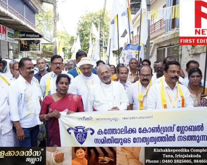 കത്തോലിക്ക കോൺഗ്രസ്സിൻ്റെ അവകാശ സംരക്ഷണ യാത്രയ്ക്ക് നഗരത്തിൽ സ്വീകരണം; മത പരിവർത്തന നിരോധനനിയമം പിൻവലിക്കണമെന്ന് മാർ പോളി കണ്ണൂക്കാടൻ.   ഇരിങ്ങാലക്കുട : രാജ്യത്തെ വിവിധ സംസ്ഥാനങ്ങളിൽ നടപ്പിലാക്കി കൊണ്ടിരിക്കുന്ന മതപരിവർത്തന നിരോധന നിയമം പിൻവലിക്കണ മെന്നും ഭരണഘടന ഉറപ്പ് നൽകുന്ന മതേതരത്വം സംരക്ഷിക്കാൻ ഭരണാധികാരികൾ തയ്യാറാവണമെന്നും മാർ പോളി കണ്ണൂക്കാടൻ ആവശ്യപ്പെട്ടു. കത്തോലിക്ക കോൺഗ്രസ് ഗ്ലോബൽ സമിതിയുടെ നേതൃത്വത്തിൽ കാസർകോഡ് നിന്നാരംഭിച്ച അവകാശ സംരക്ഷണയാത്രക്ക് ഇരിങ്ങാലക്കുട ആൽത്തറക്കൽ നൽകിയContinue Reading